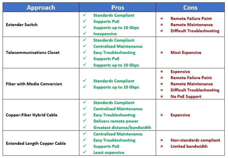 另一种基于标准的方法是在基于铜缆的运行过程中安装扩展器设备,例如小型以太网交换机或以太网扩展器。虽然这是一个相当便宜的选项,可以让您获得更多的距离,并允许您利用现有的铜缆,但扩展器设备需要本地电源,如果电源不可用,这会增加额外的费用。这些设备还增加了一个远程故障点,如果它发生故障并且没有得到很好的记录,它将花费时间和资源来解决问题。